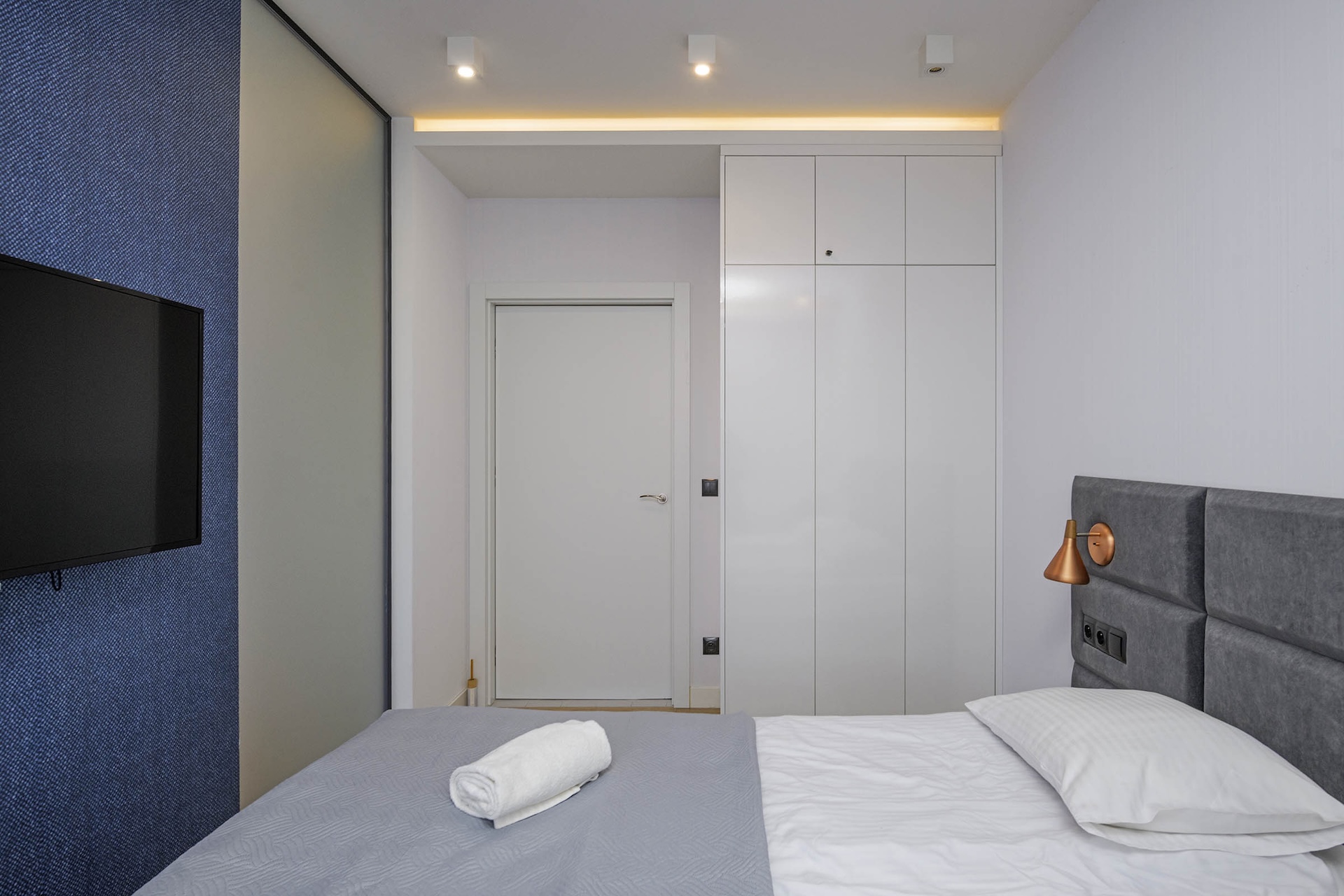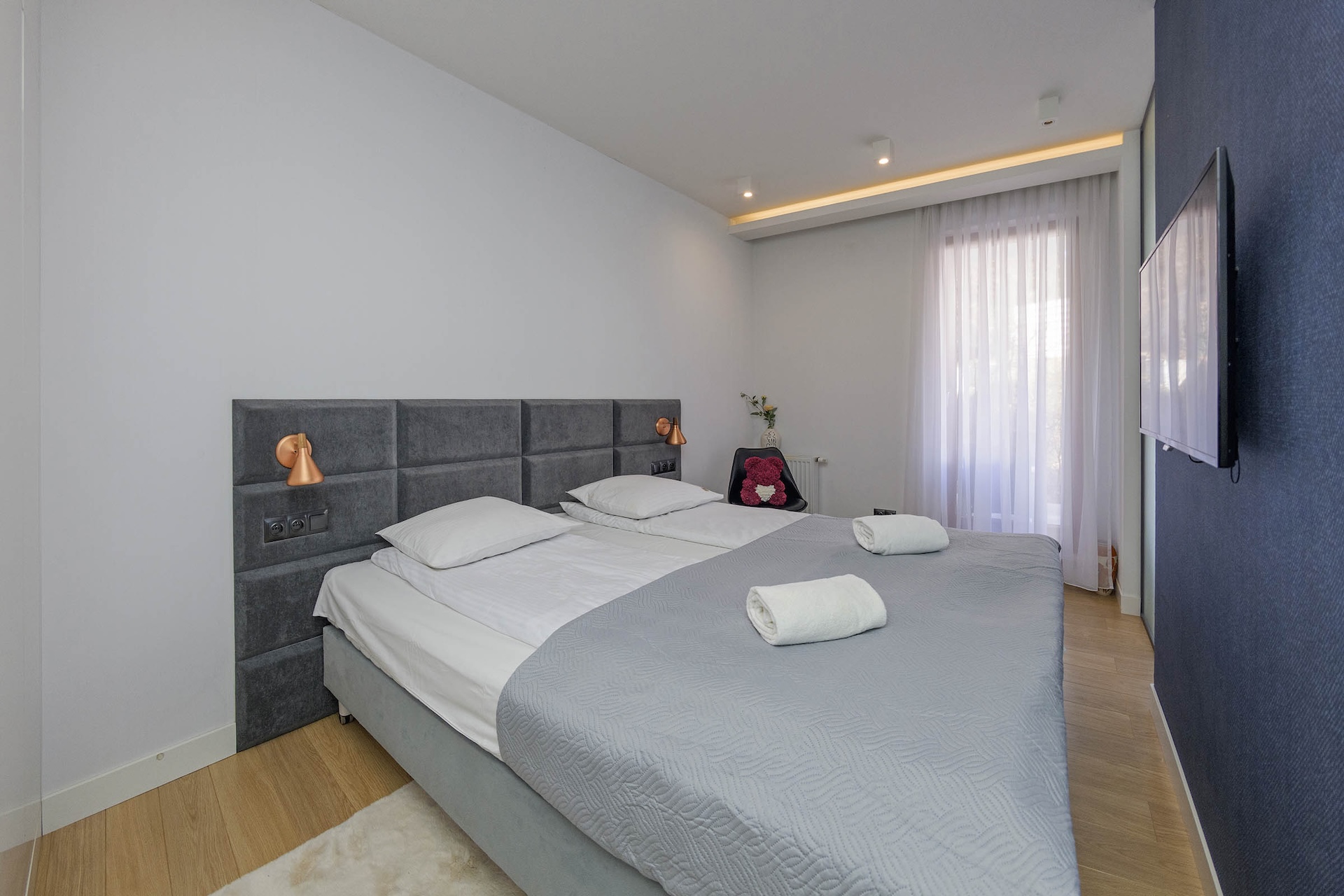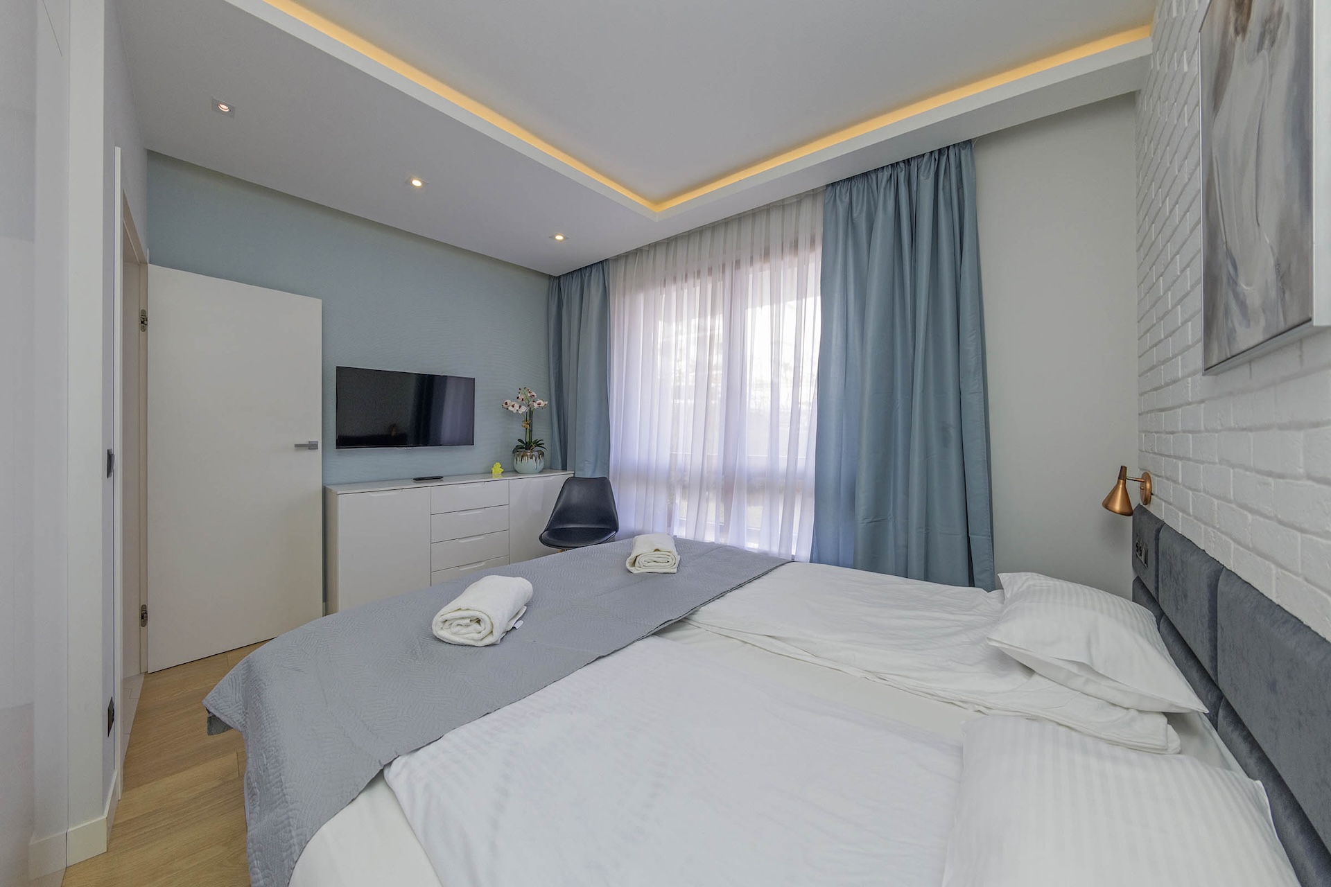 sypialnia I: łóżko typu King Size o szerokości 180cm dla 2 osób, komoda, TV LCD na ścianie