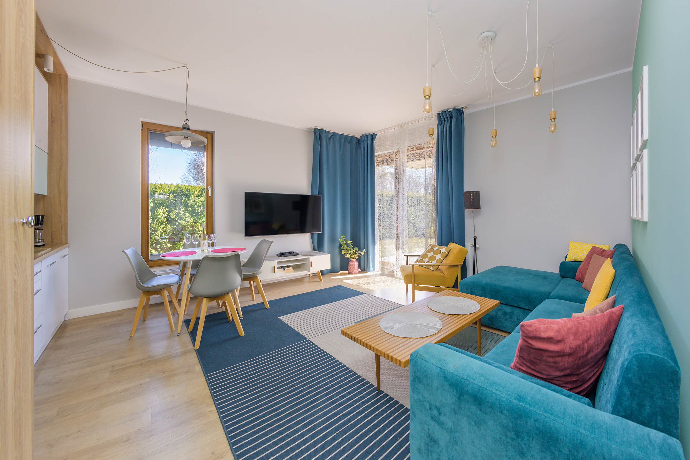 – salonu z częścią wypoczynkową oraz wyjściem na taras wraz z prywatnym ogrodem