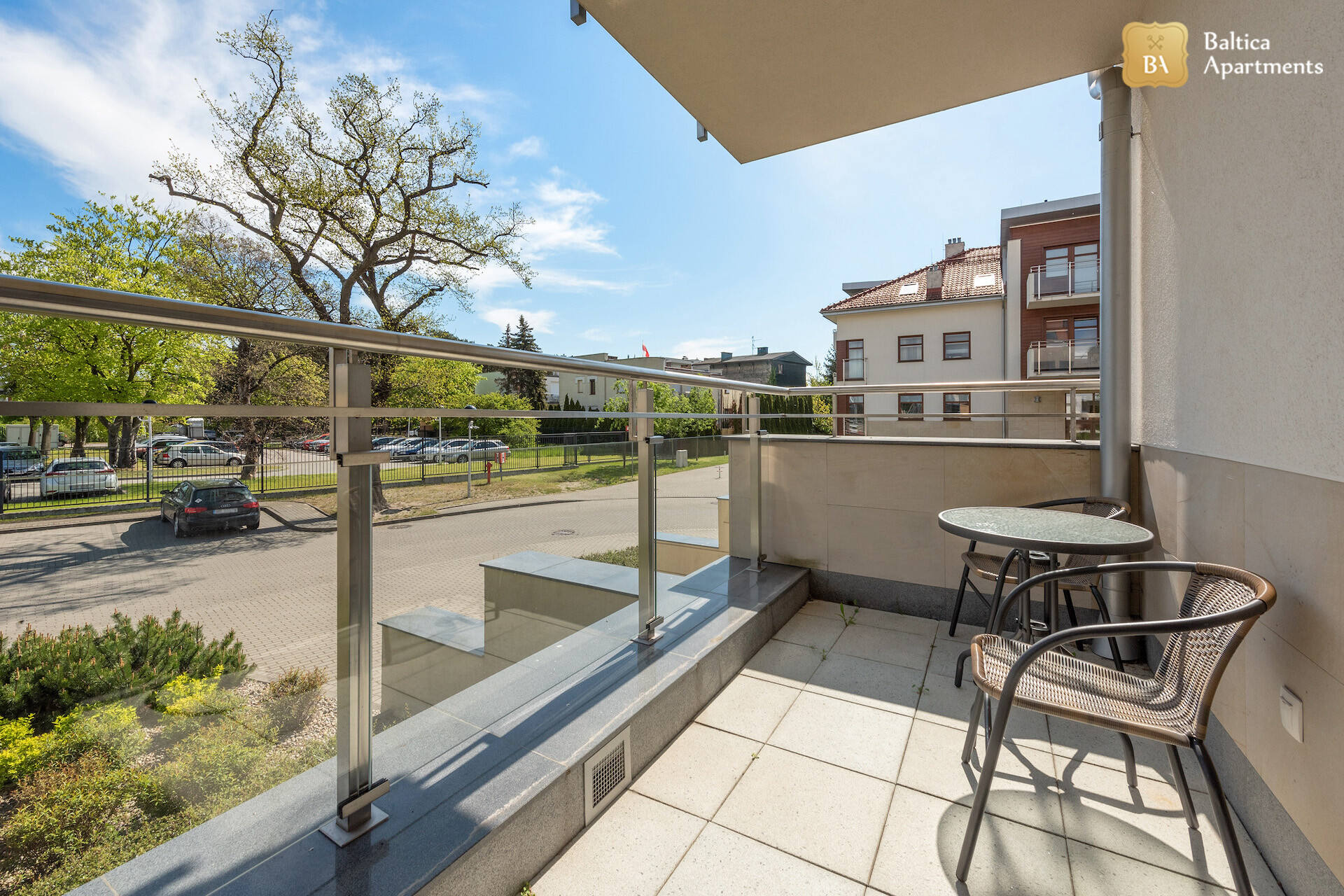 Apartament posiada duży taras z meblami ogrodowymi. Dodatkowo jest też balkon.