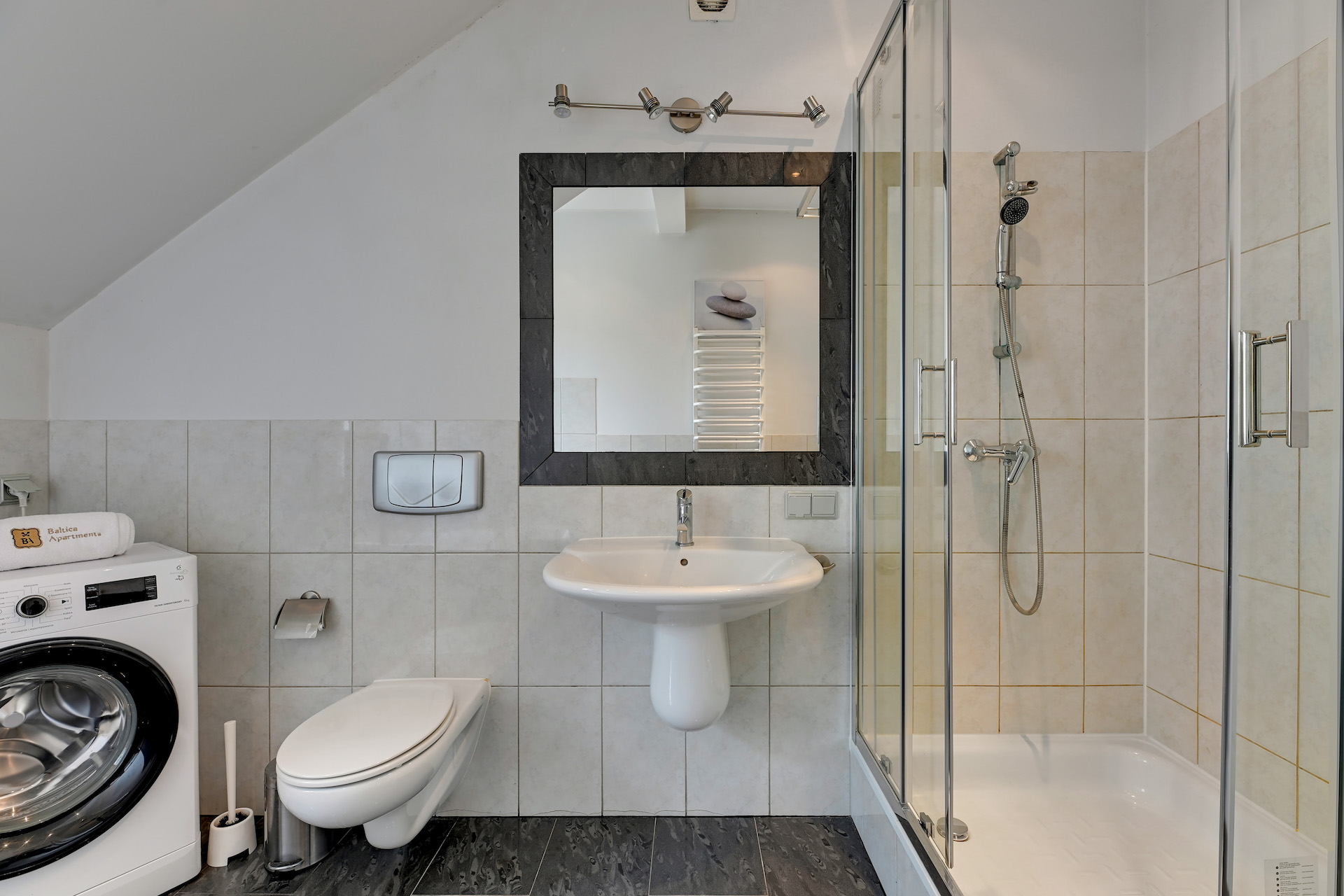 – łazienki z prysznicem, wanną i pralką